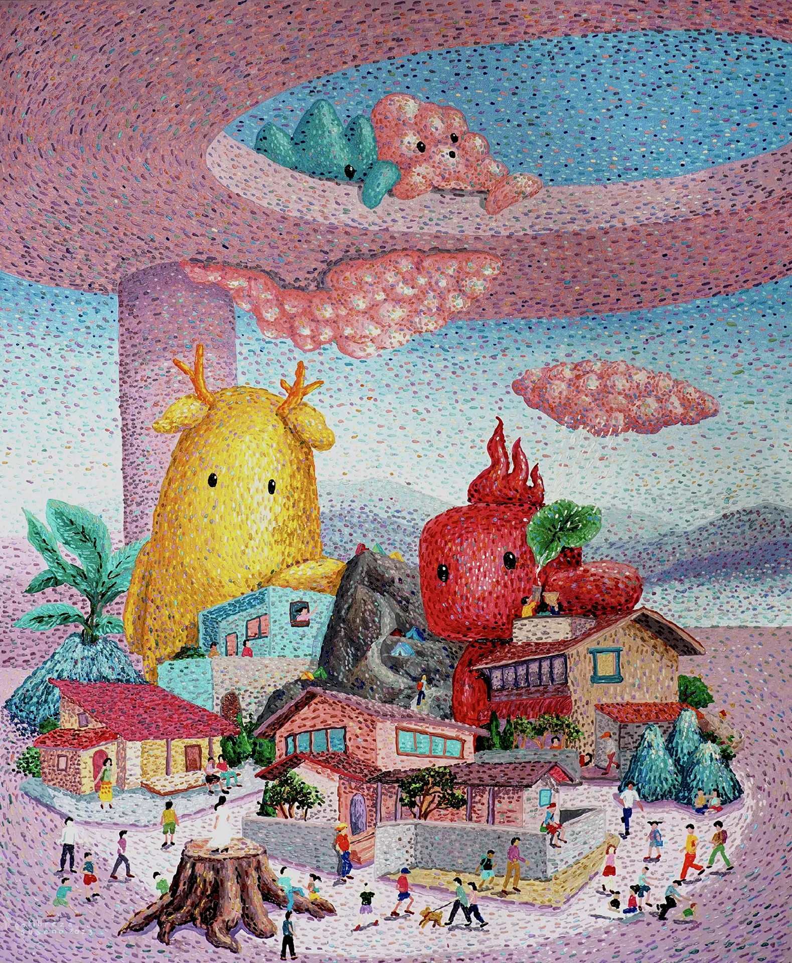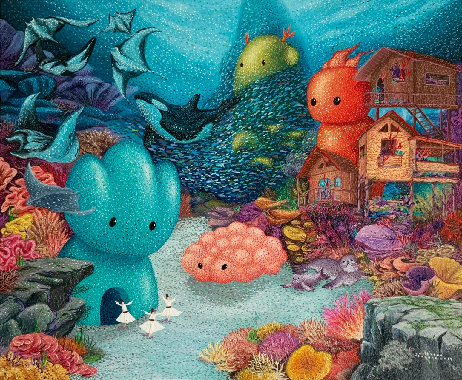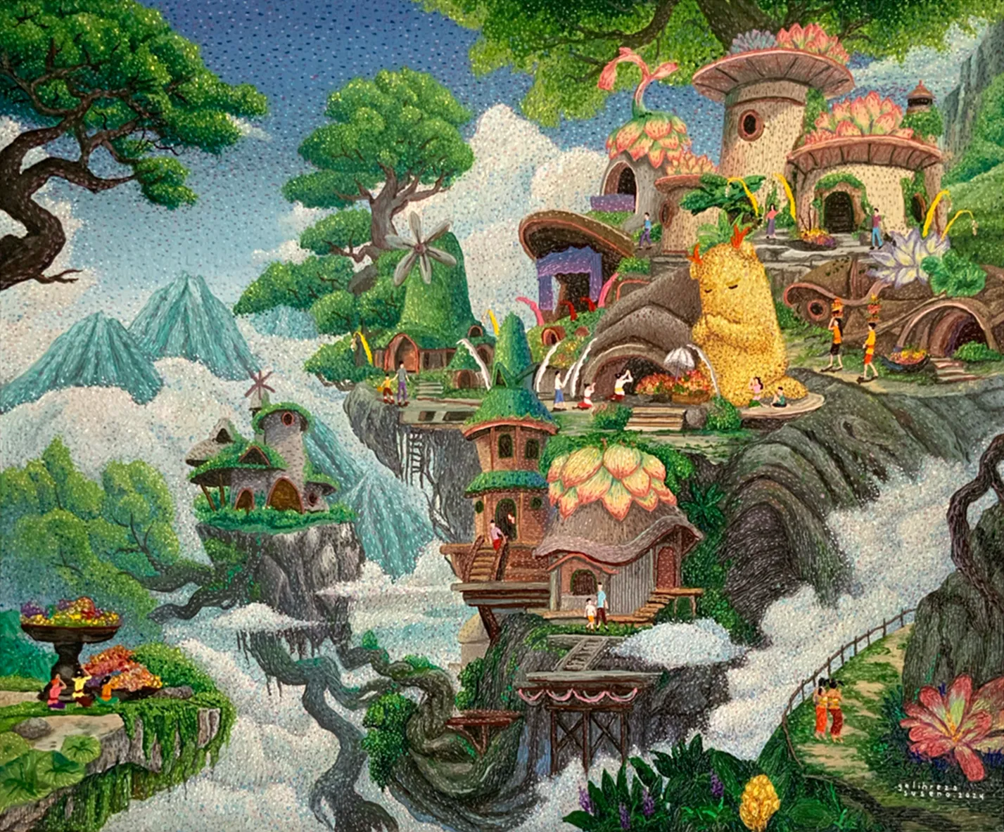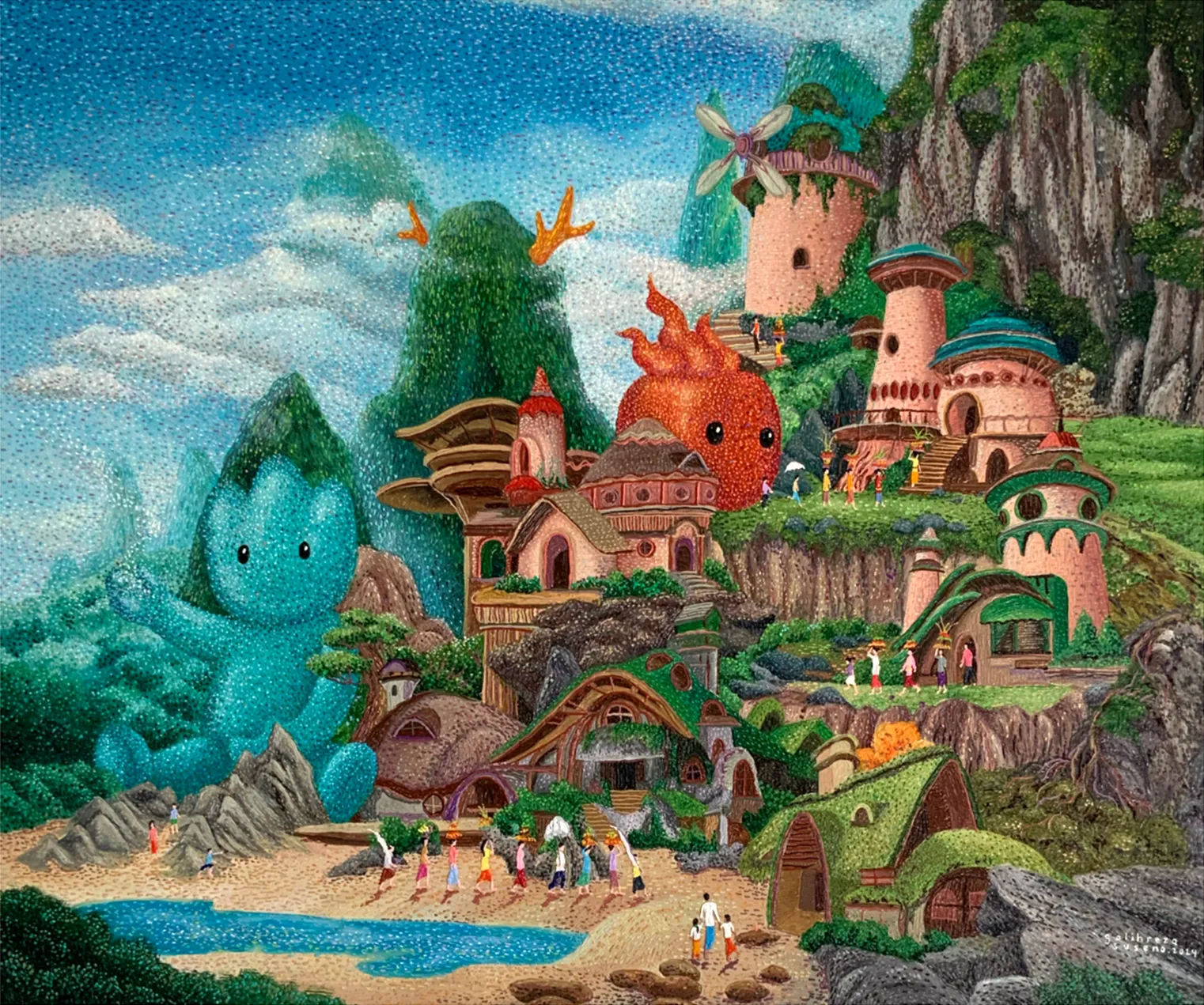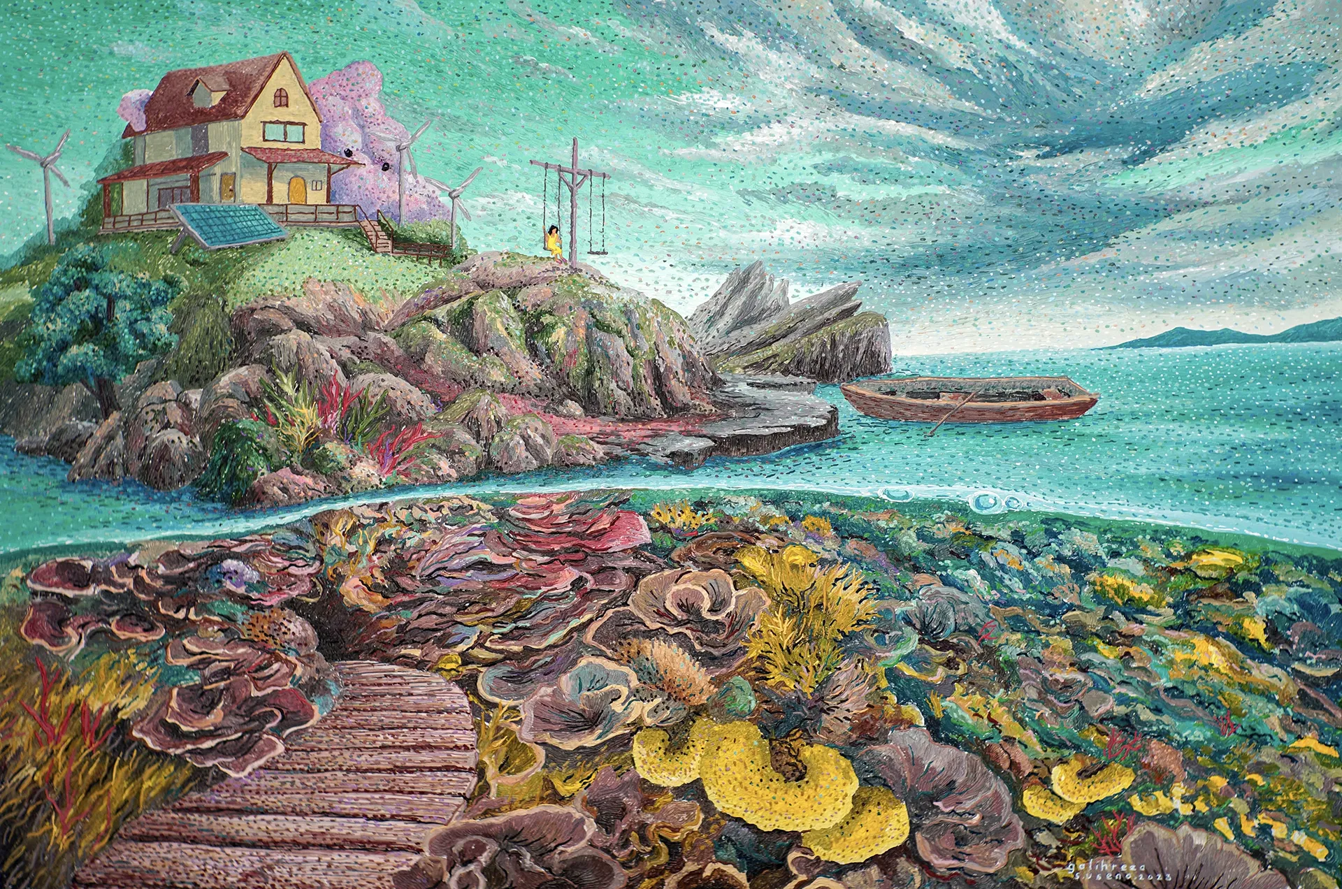 Galih’s distinctive style is characterized by an “icing-like” texture created with modeling paste, a technique inspired by his childhood memories of decorating cakes with his mother. His method of stippling paint to add dimension draws from Impressionist and Pointillist movements, resulting in idyllic landscapes that echo the fantastical storytelling of Studio Ghibli. Ultimately, “The Universe of Now” maintains a hopeful outlook, envisioning a future where nature is treated as an equal partner rather than a mere resource.