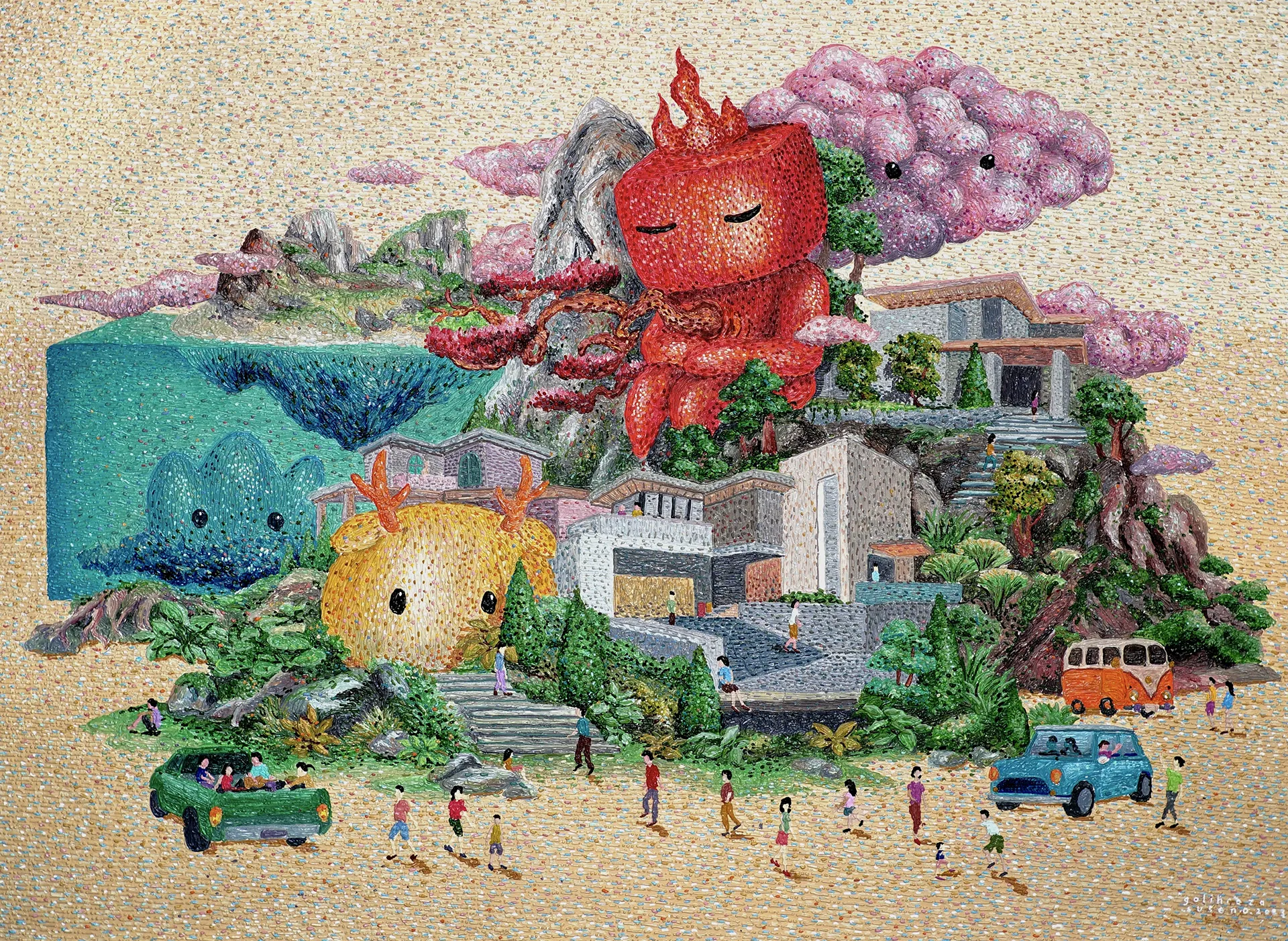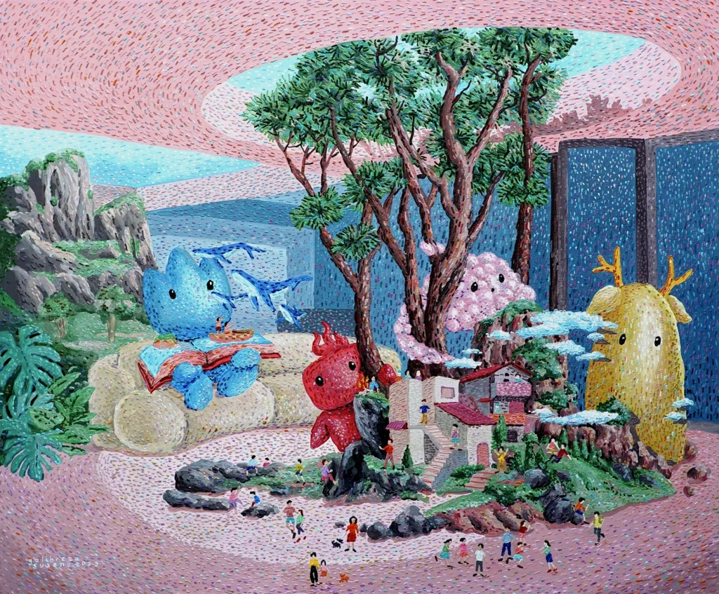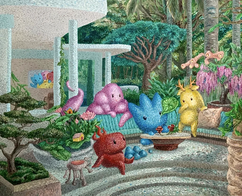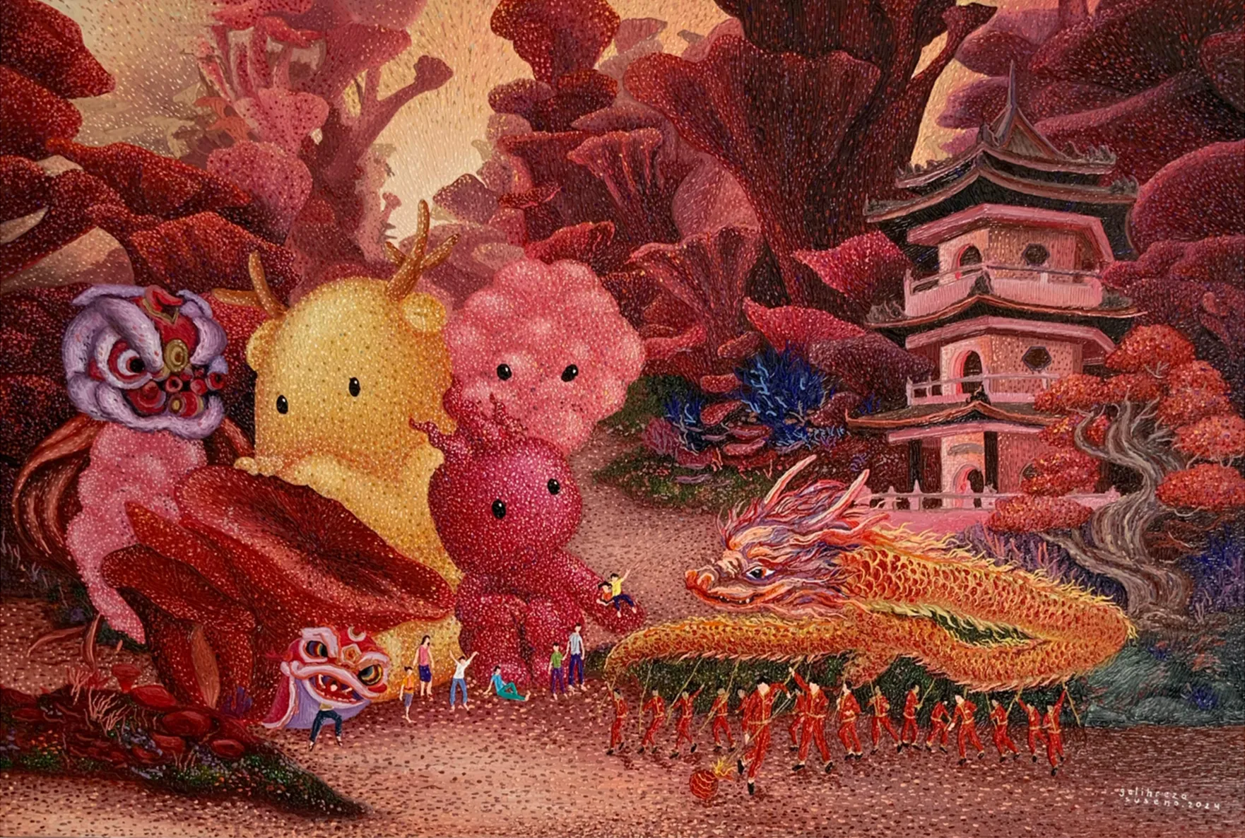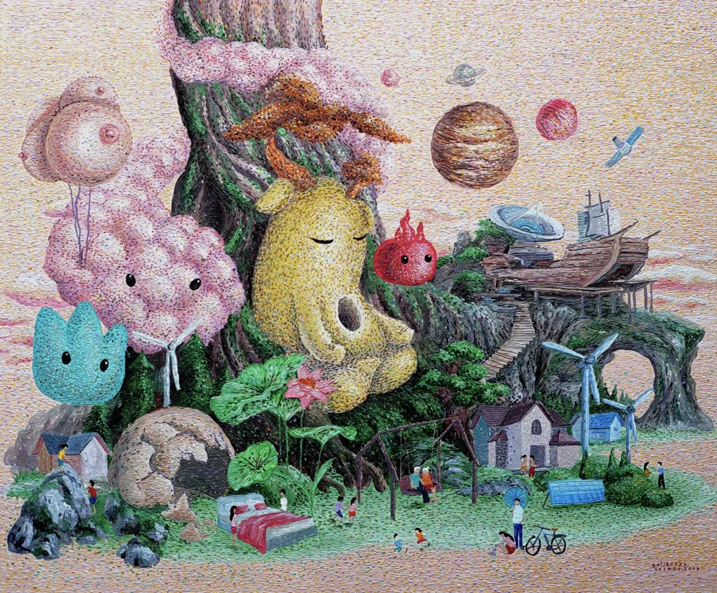 Galih’s distinctive style is characterized by an “icing-like” texture created with modeling paste, a technique inspired by his childhood memories of decorating cakes with his mother. His method of stippling paint to add dimension draws from Impressionist and Pointillist movements, resulting in idyllic landscapes that echo the fantastical storytelling of Studio Ghibli. Ultimately, “The Universe of Now” maintains a hopeful outlook, envisioning a future where nature is treated as an equal partner rather than a mere resource.