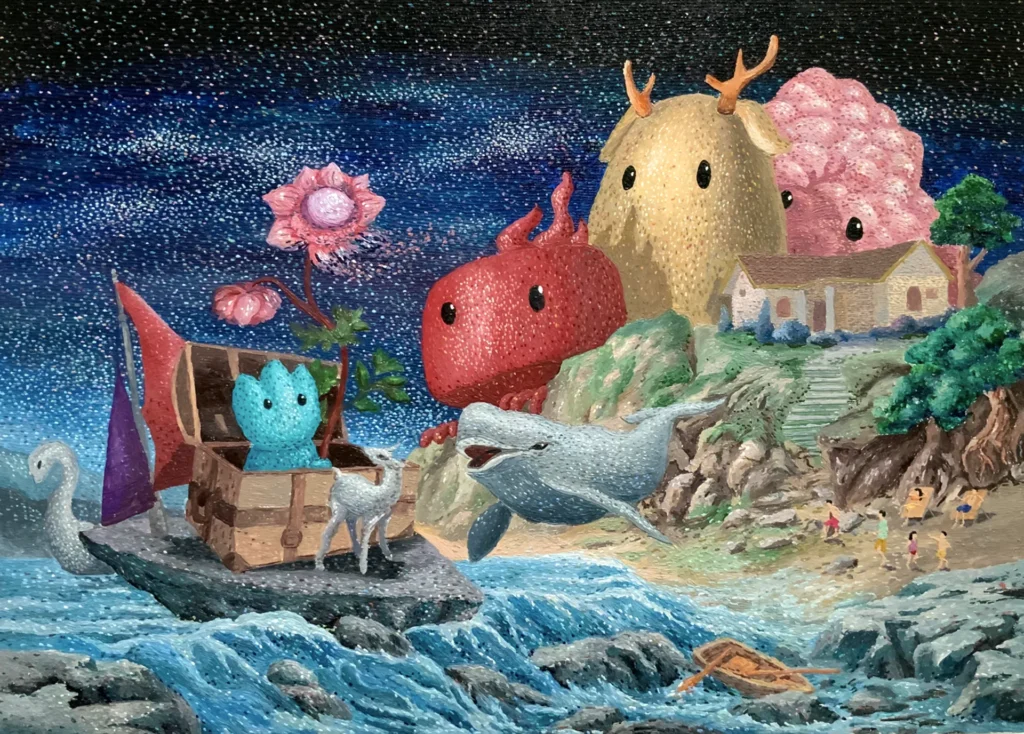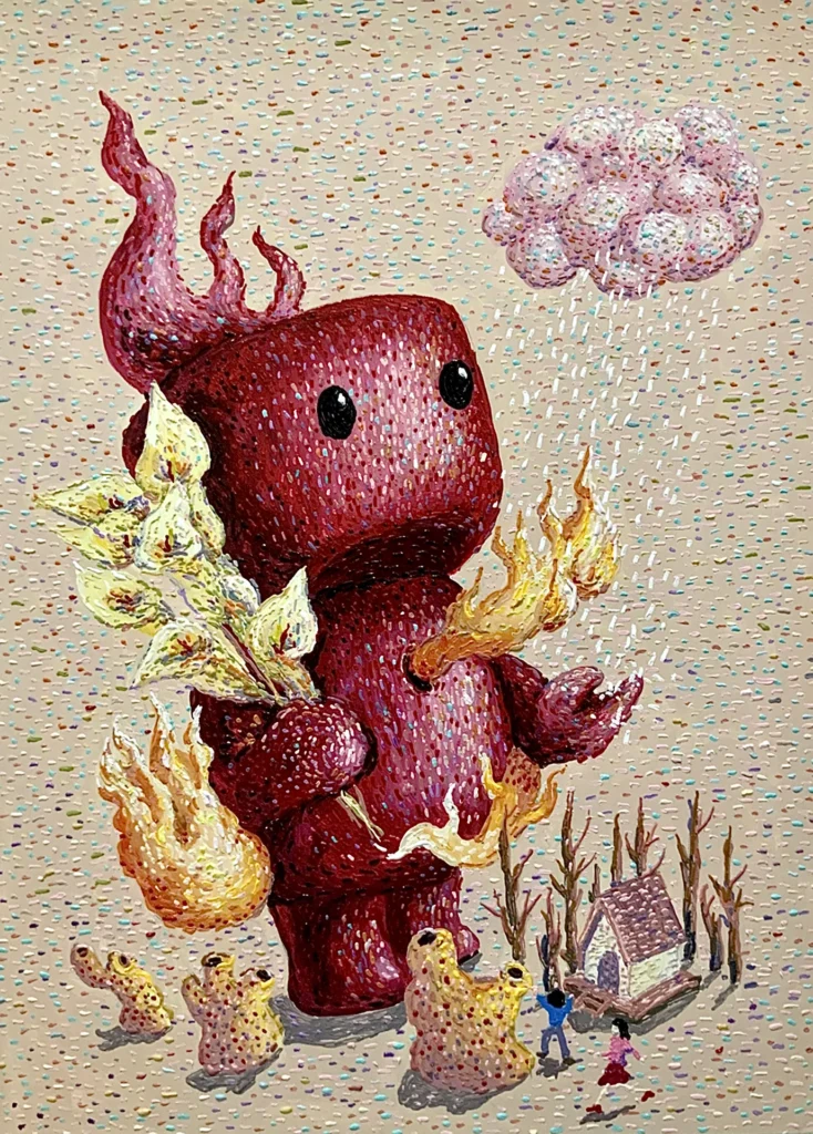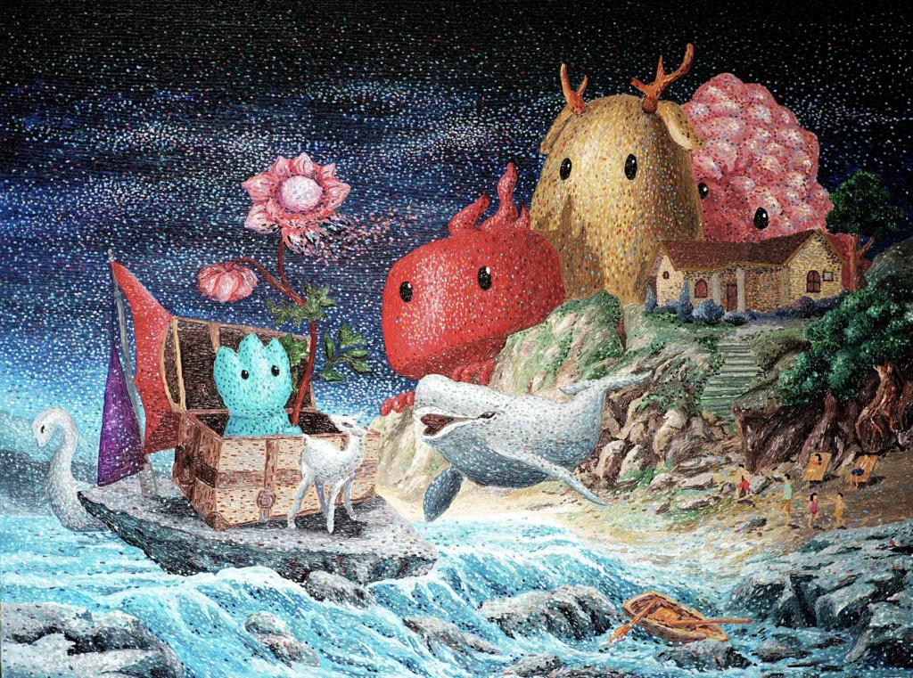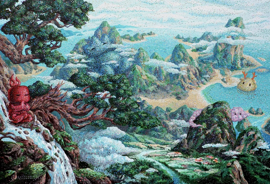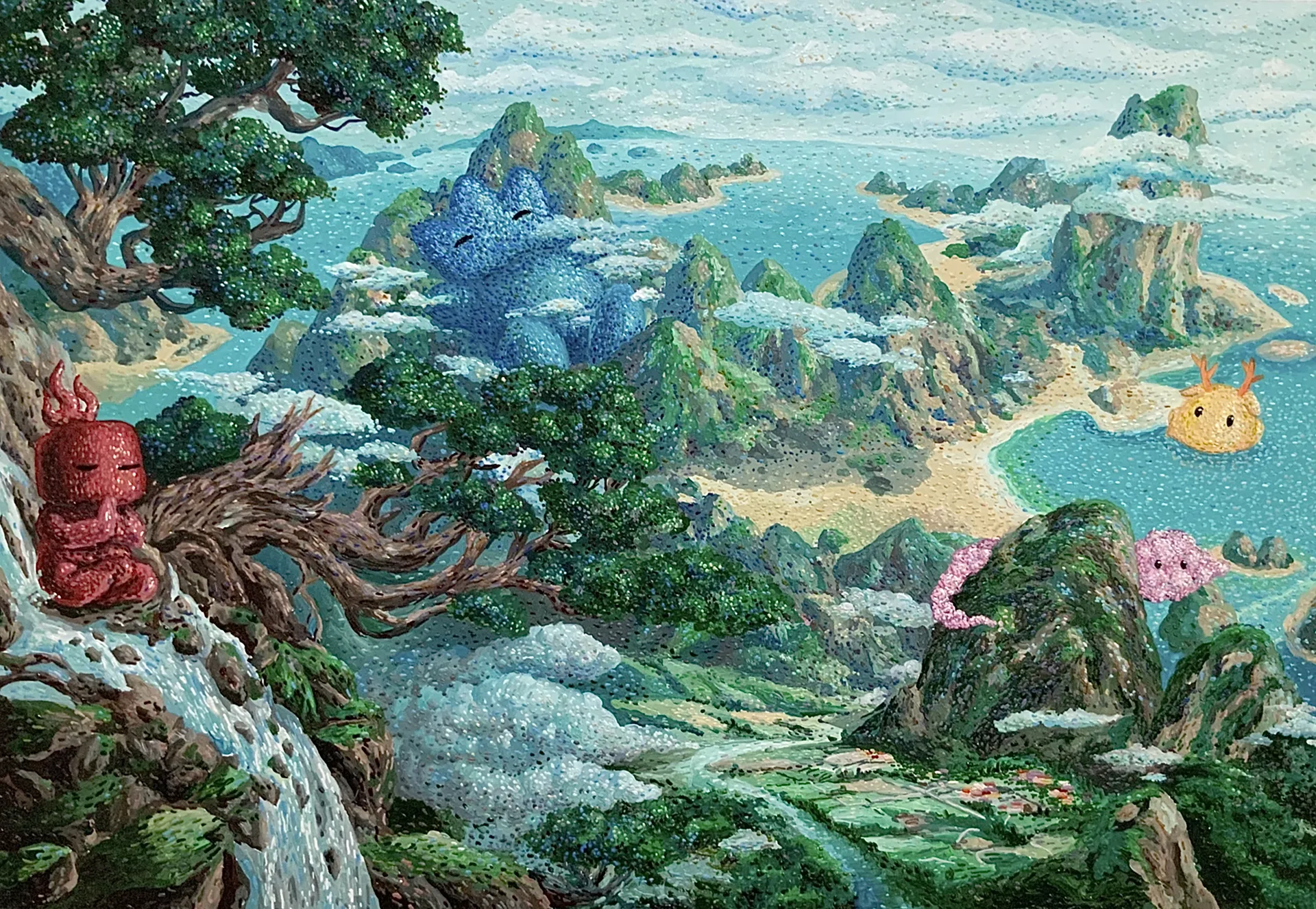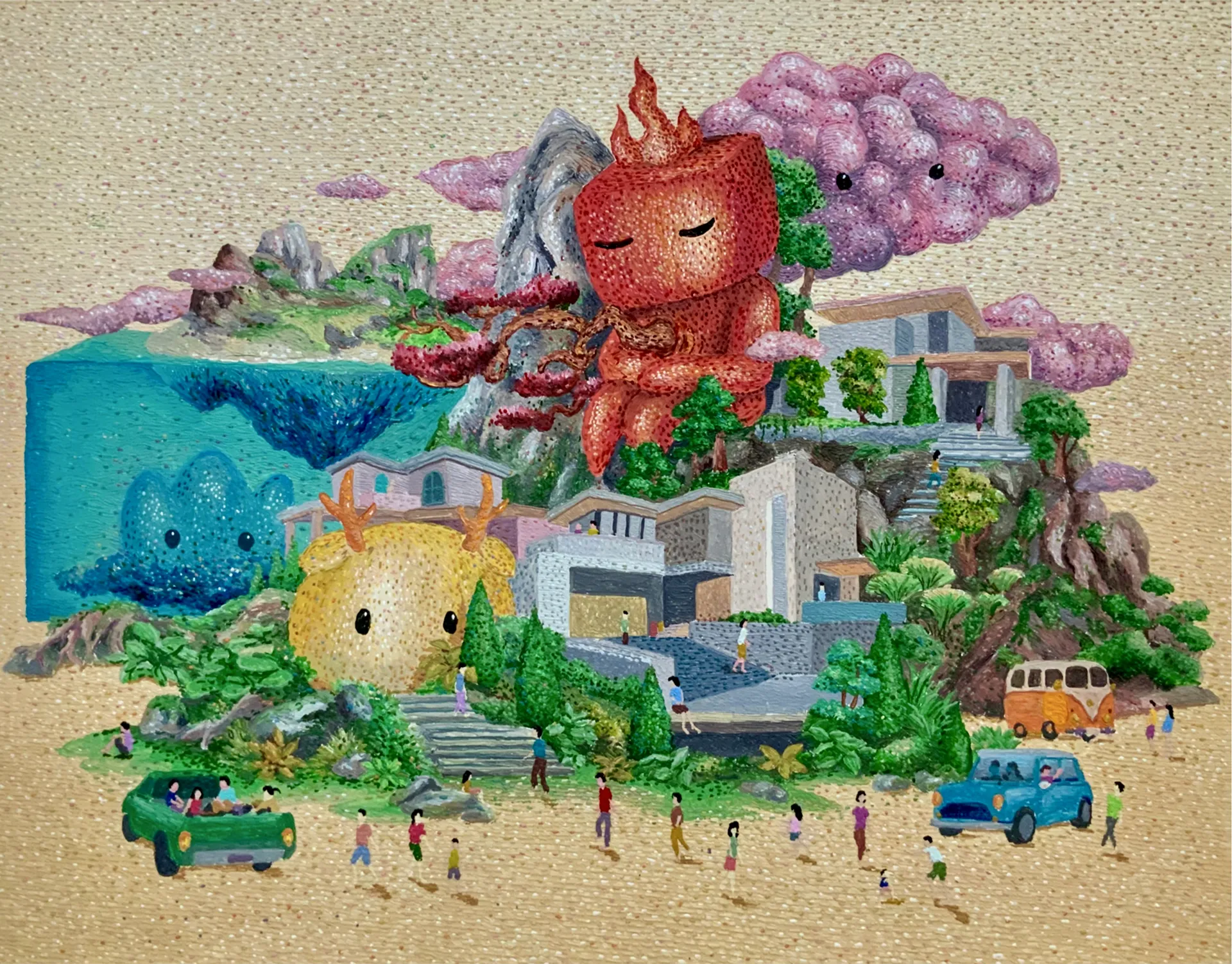Galih’s distinctive style is characterized by an “icing-like” texture created with modeling paste, a technique inspired by his childhood memories of decorating cakes with his mother. His method of stippling paint to add dimension draws from Impressionist and Pointillist movements, resulting in idyllic landscapes that echo the fantastical storytelling of Studio Ghibli. Ultimately, “The Universe of Now” maintains a hopeful outlook, envisioning a future where nature is treated as an equal partner rather than a mere resource.