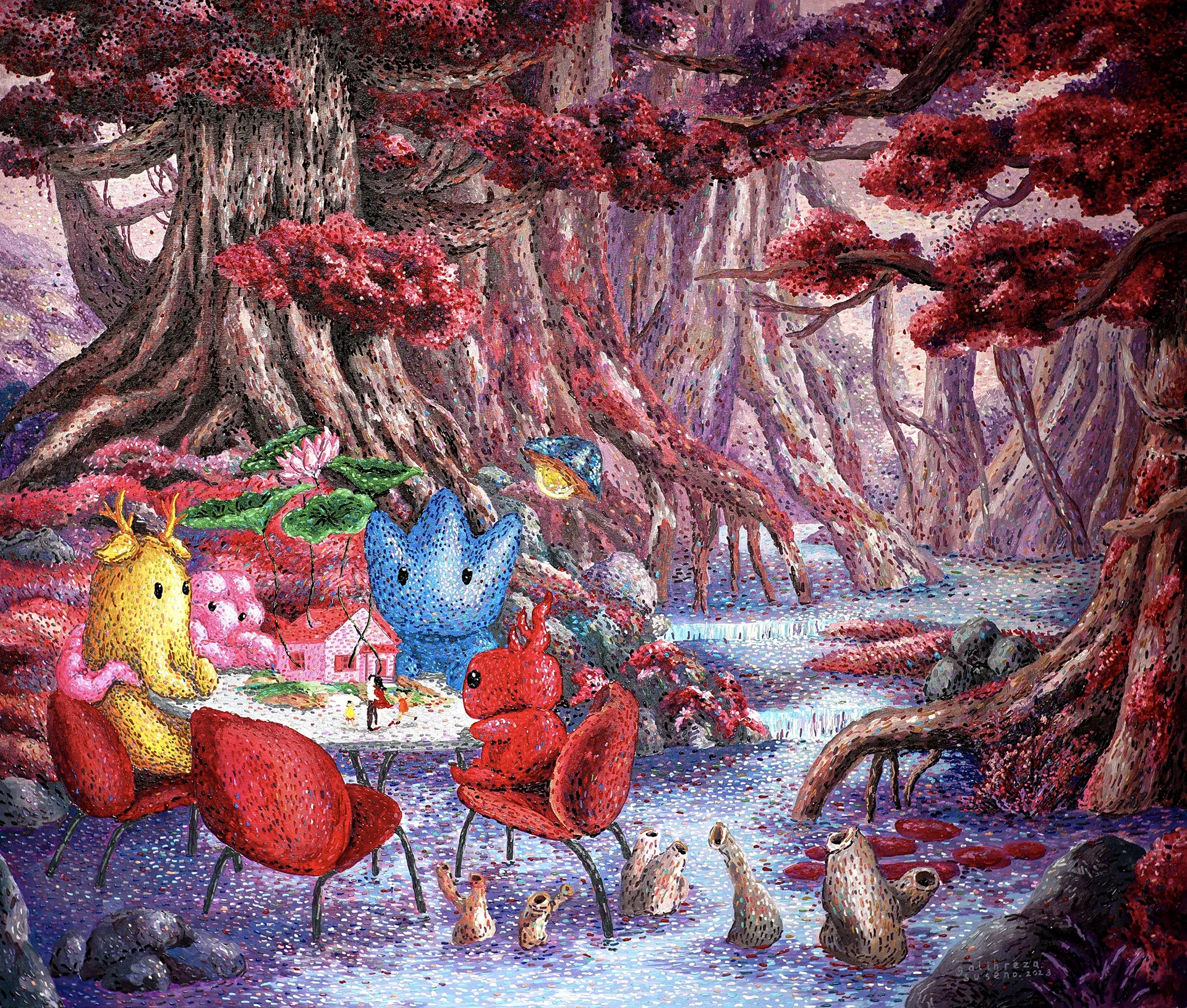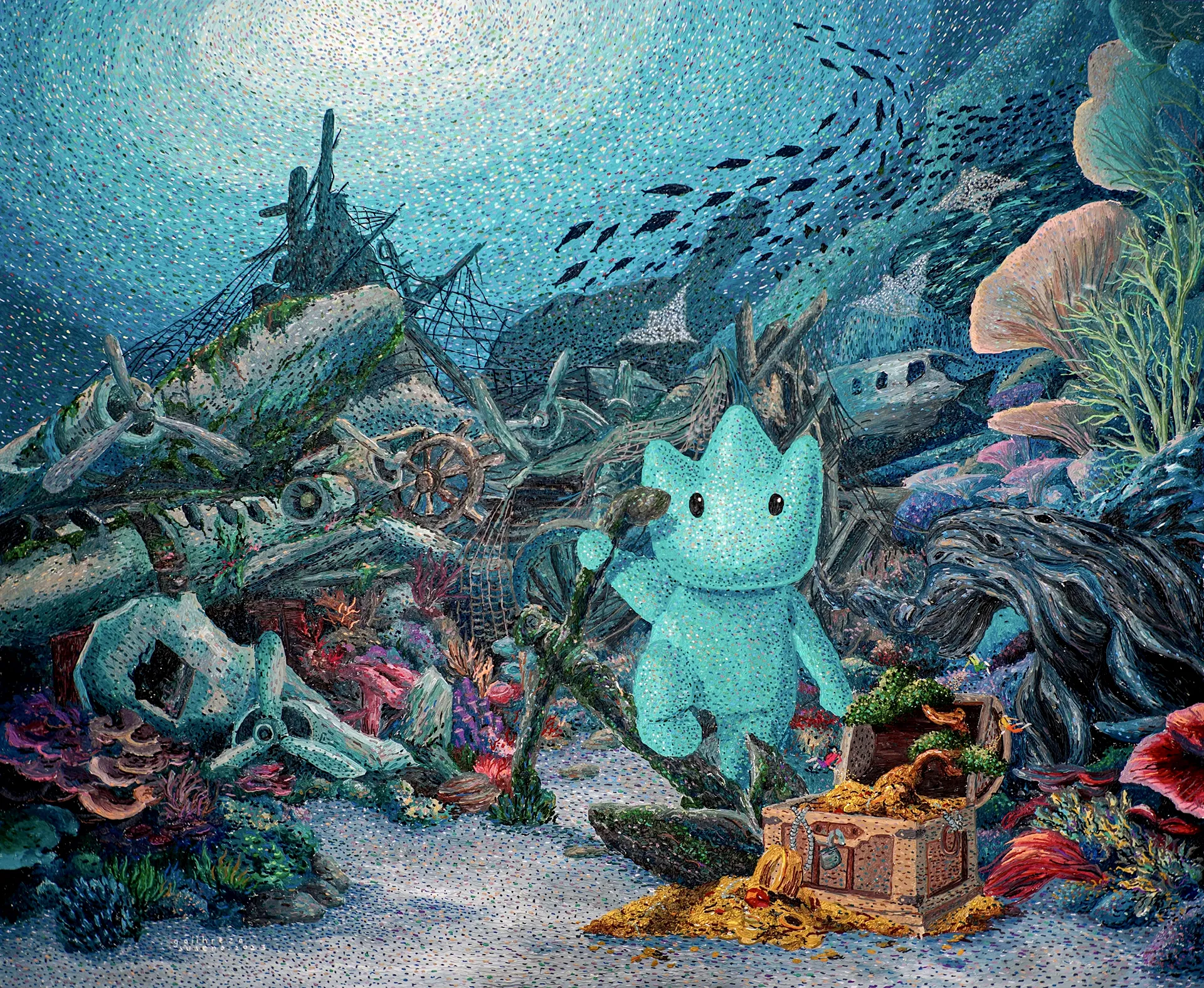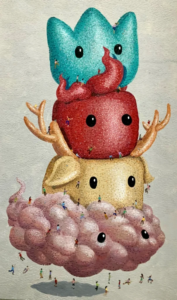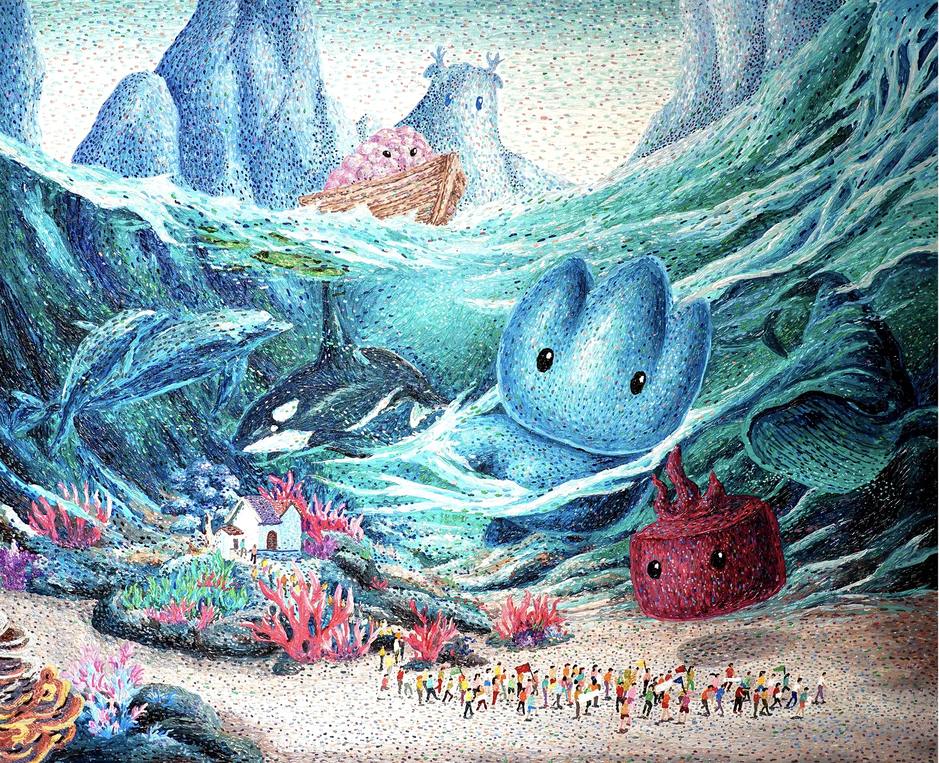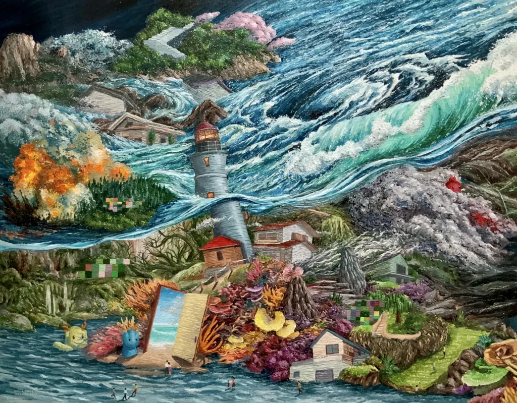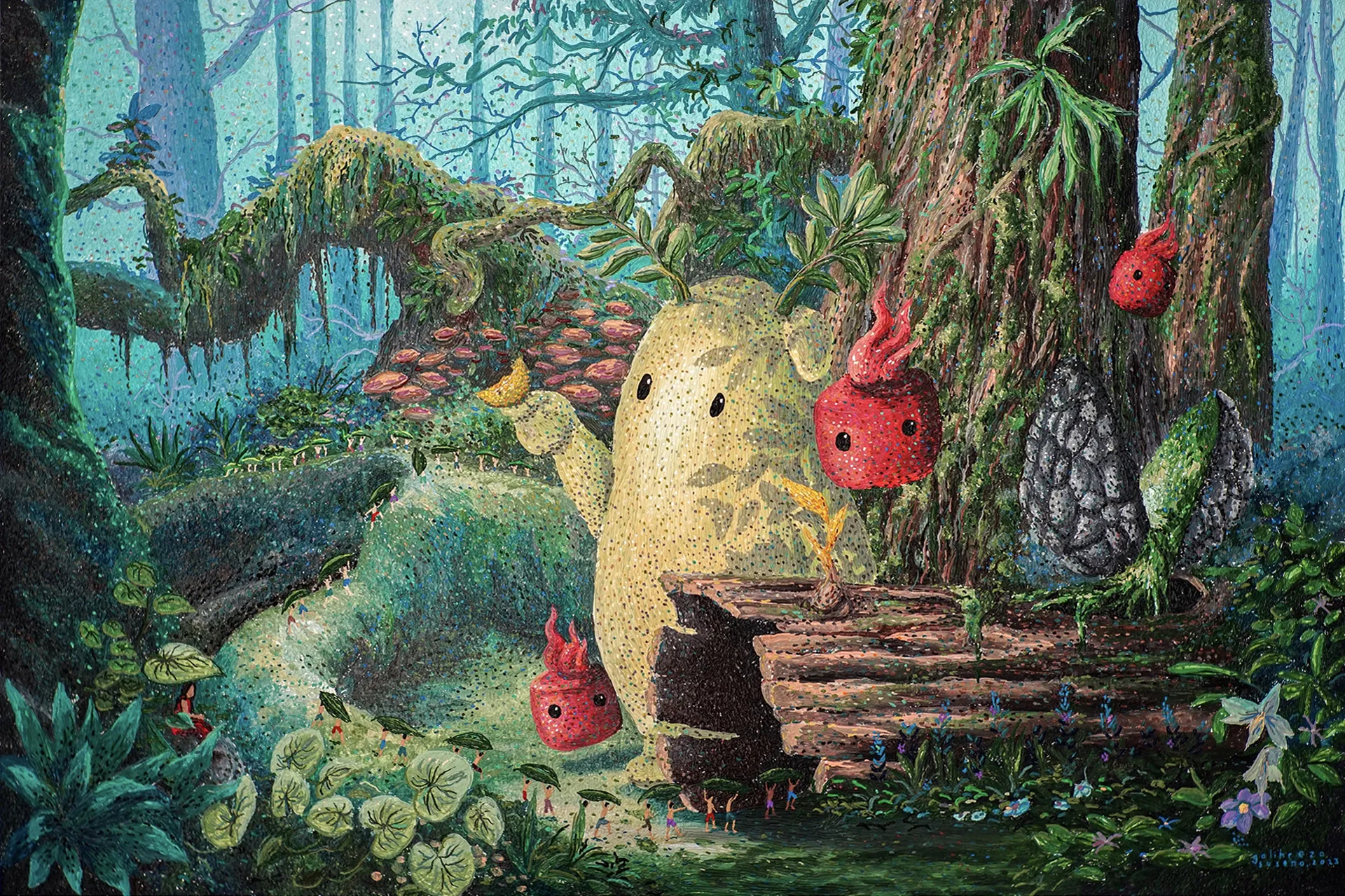 Galih’s distinctive style is characterized by an “icing-like” texture created with modeling paste, a technique inspired by his childhood memories of decorating cakes with his mother. His method of stippling paint to add dimension draws from Impressionist and Pointillist movements, resulting in idyllic landscapes that echo the fantastical storytelling of Studio Ghibli. Ultimately, “The Universe of Now” maintains a hopeful outlook, envisioning a future where nature is treated as an equal partner rather than a mere resource.